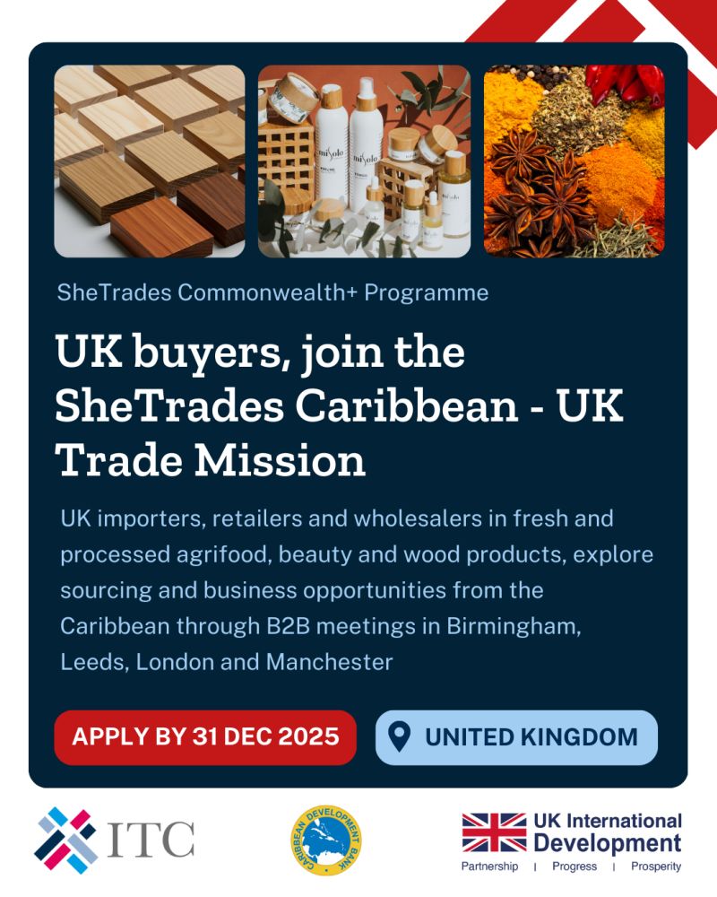 This Trade Mission is organized by the International Trade Centre (ITC) as part of the SheTrades Commonwealth+ Programme, funded by UK International Development, and in collaboration with Caribbean Development Bank and UK-based chambers of commerce.