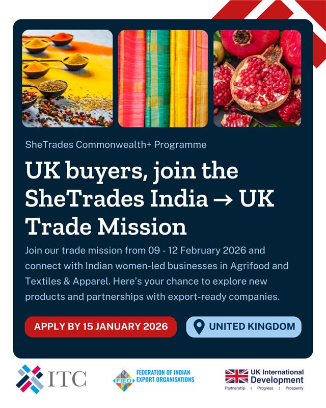 This Trade Mission is organized by the International Trade Centre (ITC) as part of the SheTrades Commonwealth+ Programme, funded by UK International Development, and in collaboration with SheTrades India Hub (hosted by Federation of Indian Export Organisations) and UK-based chambers of commerce.