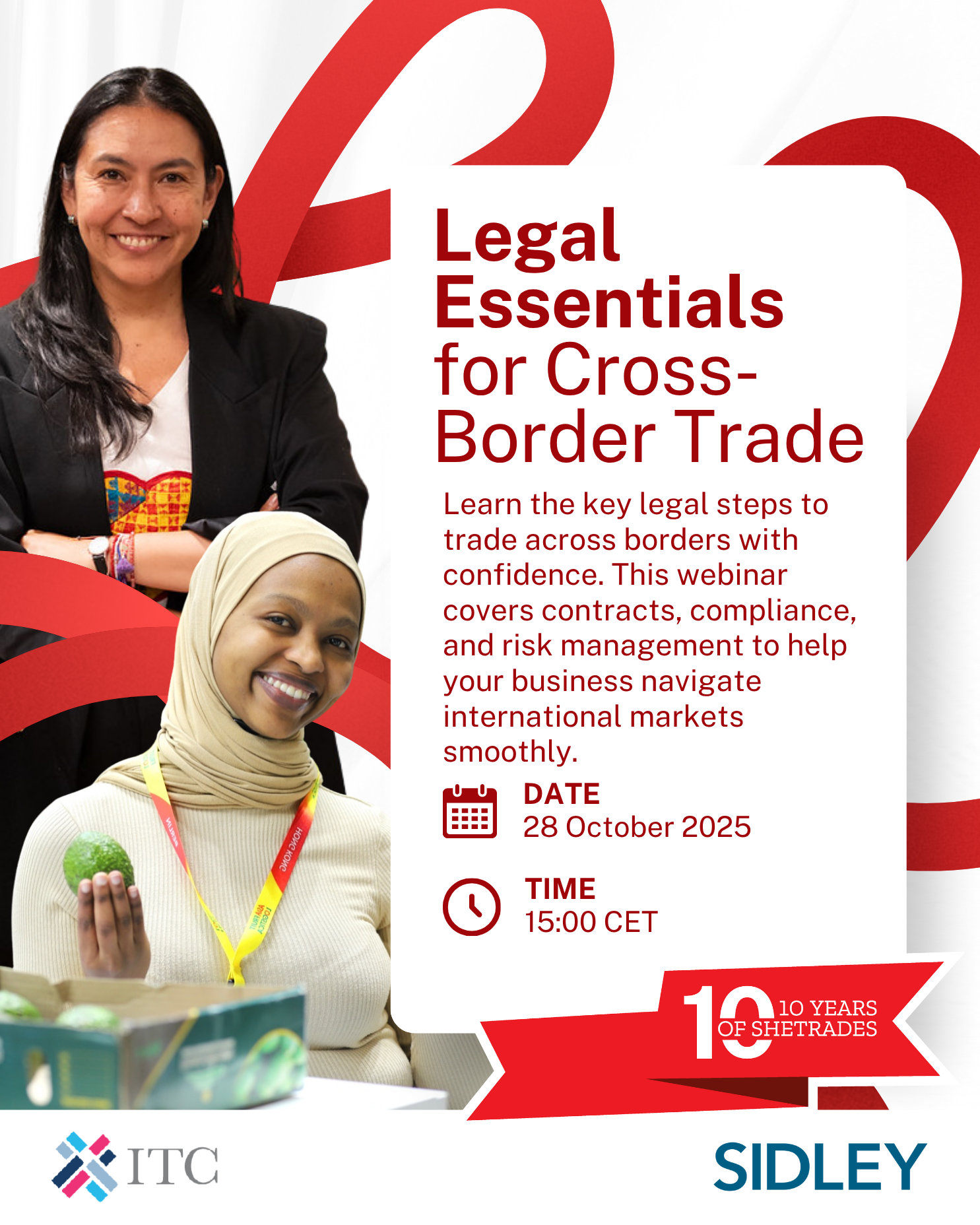 For ten years, our partners have helped SheTrades grow and make a difference. Now they’re coming together to share their best in the SheTrades@10 Masterclass series: six sessions packed with practical tips to protect your brand, move your goods, and reach new markets.